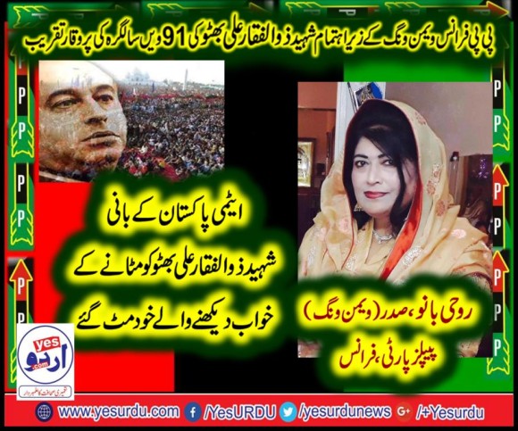 پیرس (مانیٹرنگ رپورٹ)روحی بانو صدر پیپلزپارٹی ویمن ونگ فرانس کے زیر اہتمام شہید ذوالفقار علی بھٹو کی ۔ 91 ویں سالگرہ انتہائی عقیدت واحترام سے منائی گئی