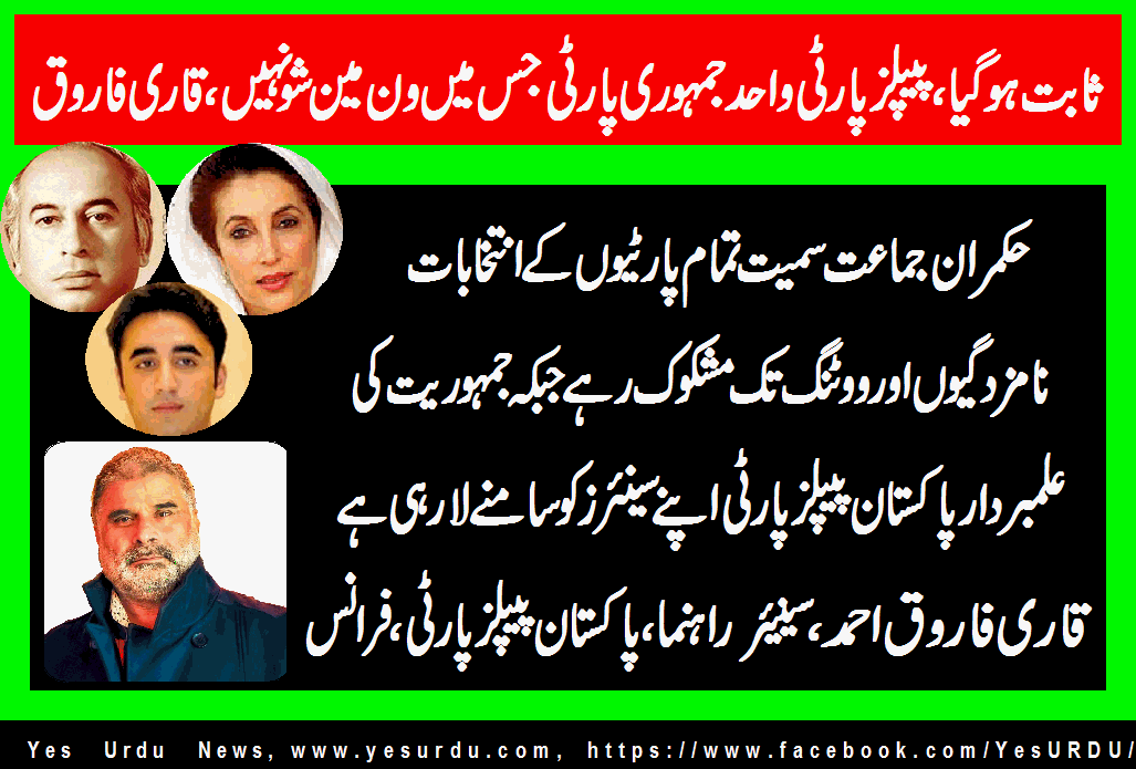 پیرس(یس اردو نیوز)قاری فاروق احمد،سینیئر راہنما، پاکستان پیپلز پارٹی ،فرانس نے اپنے بیان میں کہا ہے کہ حکمران جماعت سمیت تمام پارٹیوں کے انتخابات نامزدگیوں اور ووٹنگ تک مشکوک رہے جبکہ جمہوریت کی علمبردارپاکستان پیپلز پارٹی اپنے سینئرز کو سامنے لا رہی ہے۔ثابت ہوگیا ،پیپلز پارٹی واحد جمہوری پارٹی جس میں ون مین شو نہیں۔بہترین جمہوری اقدار کی پاسدار اور صحیح معنوں میں عوامی جماعت کے منشور پرگامزن ہے