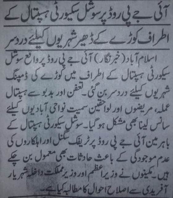 اسلام آبد: (اصغر علی مبارک) یہ خوبصورت اسلام آباد کا علاقہ آئی جے پرنسپل روڈ کے اطراف ہے وفاقی حکومت صحت مند پاکستان کیلئے دعوے کررہی ہے۔ جبکہ راولپنڈی اسلام آباد کا سارا کوڑا کرکٹ سوشل سیکیورٹی ہسپتال کے مریضوں، ڈاکٹروں، تیمارداروں کیلئے درد سر بنا ہوا ہے