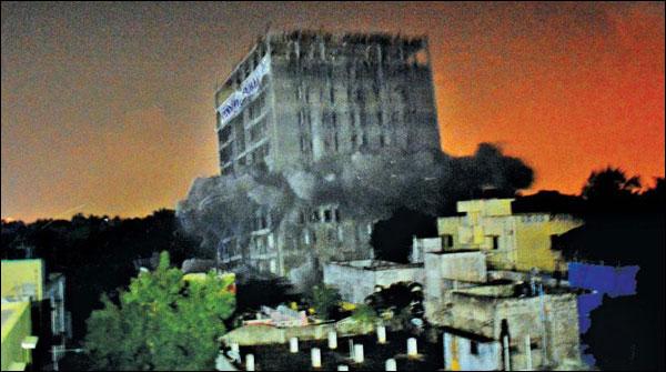 بھارتی شہر چنائی میں بھی ایسی ہی ایک 11منزلہ عمارت کو دھماکا خیز مواد سے تین سیکنڈز میں ملبے کا ڈھیر بنا دیا گیا۔
