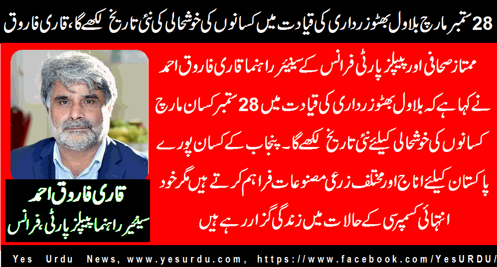 پیرس(ایس ایم حسنین)ممتاز صحافی اورپیپلز پارٹی فرانس کے سینیئر راہنما قاری فاروق احمد نے کہا ہے کہ بلاول بھٹو زرداری کی قیادت میں28ستمبر کسان مارچ کسانوں کی خوشحالی کیلئے نئی تاریخ لکھے گا۔ پنجاب کے کسان پورے پاکستان کیلئے اناج اور مختلف زرعی مصنوعات فراہم کرتے ہیں مگر خود انتہائی کسمپرسی کے حالات میں زندگی گزار رہے ہیں۔ پنجاب حکومت جھوٹے دعووں میں ماہر ہے اور اس دیرینہ مسئلے پر مدت سے چشم پوشی کر رہی ہے جبکہ یہ نہائت حساس معاملہ ہے۔ پنجاب کے کسان چور بازاری اور آجروں کے استحصال کا بھی شکار ہیں جس کیلئے کافی عرصے سے کوئی منصوبہ بندی نہیں کی جارہی۔اس کے ساتھ ساتھ کسانوں کو ان کی فصلوں کی مناسب قیمت بھی نہیں مل پاتی جس کی سب سے بڑی وجہ ن لیگ کے حکومتی وزرا کا مافیا ز سے میل جول ہے۔