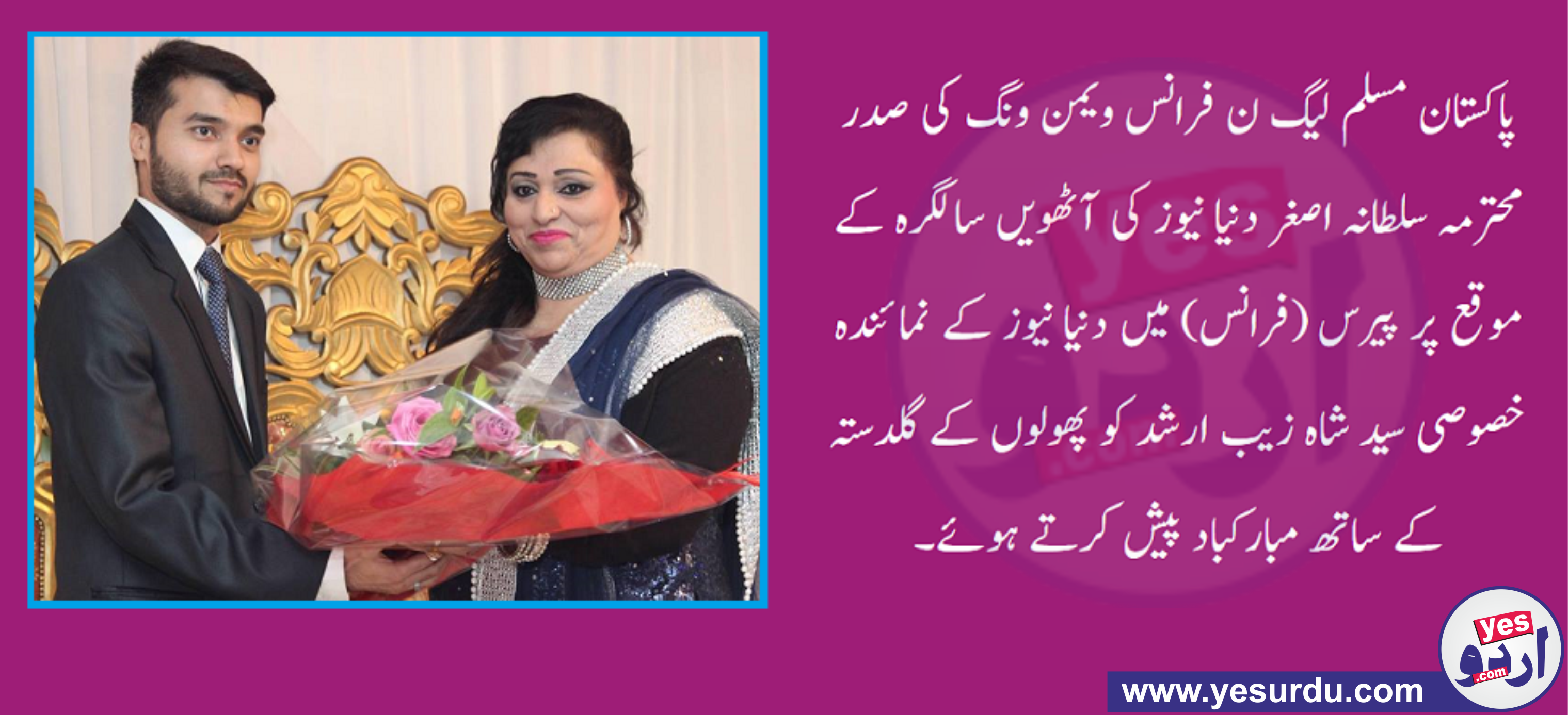 پیرس۔ پاکستان مسلم لیگ ن فرانس ویمن ونگ کی صدر محترمہ سلطانہ اصغر دنیا نیوز کی آٹھویں سالگرہ کے موقع پر پیرس (فرانس) میں دنیا نیوز کے نمائندہ خصوصی سید شاہ زیب ارشد کو پھولوں کے گلدستہ کے ساتھ مبارکباد پیش کرتے ہوئے۔