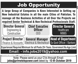 A, LARGE, GROUP, OF, COMPANIES, SETING, UP, ITS, INDUSTRIAL, ESTATES, BUSINESS, IN, ALL, CITIES, OF,PAKISTAN, REQUIRED, DIRECTOR, GENERAL, FOR ENGINEERING, AND, CONSTRUCTIONS, PROJECT DIRECTOR FINANCE & ACCOUNTCS, CEO, DIRECTOR, GENERAL, HEALTH CARE, HEAD OF DEPARTMENT, EX-GOVT, OFFICER, BANKERS
