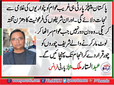 پیرس(ایس ایم حسنین) پاکستان پیپلز پارٹی کے سینئر راہنما عبدالستار ملک آف فرانس نے اپنے بیان میں کہا ہے کہ پیپلز پارٹی ہی غریب عوام کو پٹواریوں کی غلامی سے نجات دلائے گی۔ اور ان شریفوں کی فرعونیت کا دھڑن تختہ کریگی۔وہ دن دور نہیں جب عوام سر اٹھا کر لوٹ مار کرنے والے شریف چوروں کو چورقرا ر دے کر انجام تک پہنچائیں گے۔