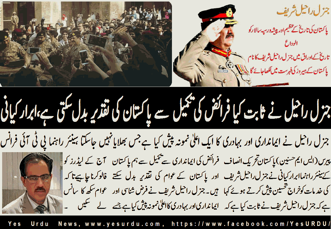 پیرس (ایس ایم حسنین)پاکستان تحریک انصاف کے سینئر راہنما ابرار کیانی نے جنرل راحیل شریف کی خدمات کو خراج تحسین پیش کرتے ہوئے کہا ہے کہ جنرل راحیل شریف نے ثابت کیا ہے کہ فرائض کی ایمانداری سے تکمیل سے ہم پاکستان اور پاکستان کے عوام کی تقدیر بدل سکتے ہیں۔جنرل راحیل شریف نے فرض شناسی اور ایمانداری اور بہادری کا اعلیٰ نمونہ پیش کیا ہے جسے آج کے لیڈرز کو فالو کرنا چاہیے تاکہ عوام سکھ کا سانس لے سکیں ۔