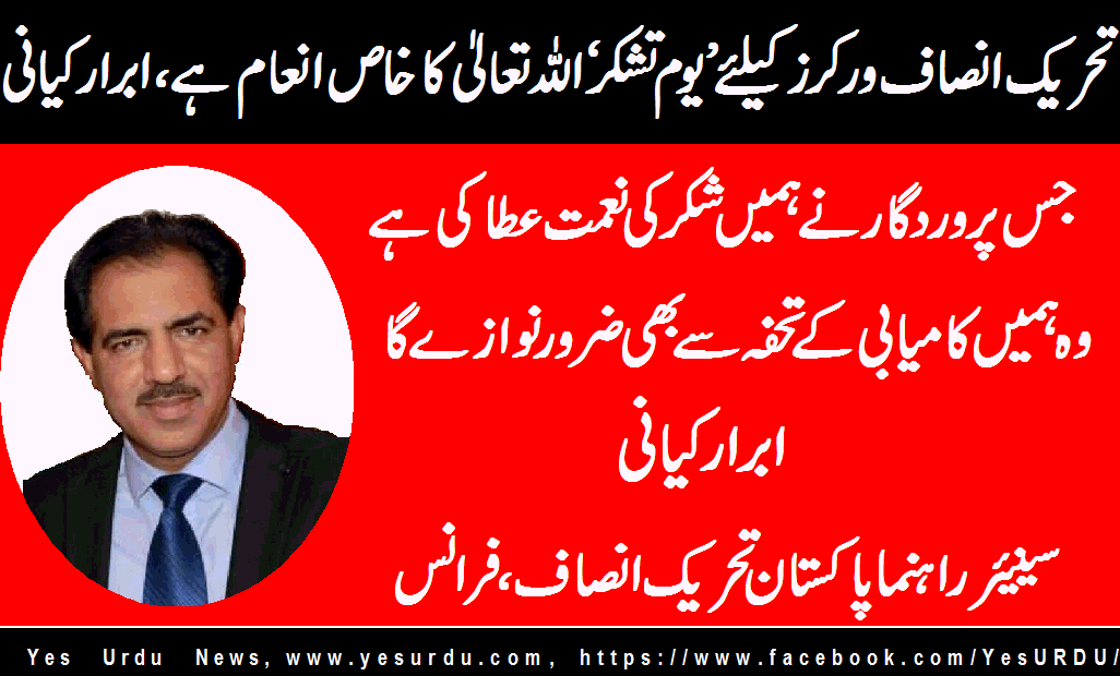 پیرس(یس اردو نیوز) پیرس میں پاکستان تحریک انصاف کی طرف سے یوم تشکر منایا گیا جس میں پاکستان میں موجود تحریک انصاف کی قیادت کے ساتھ اظہار یکجہتی کیا گیا۔ اس موقع پر سینیئر راہنما پاکستان تحریک انصاف فرانس نے یس اردو نیوز کے ساتھ بات چیت کرتے ہوئے کہا کہ یوم تشکر پاکستان تحریک انصاف ورکرز کیلئے اللہ تعالیٰ کا خصوصی انعام ہے ۔ہمارا کامل ایمان ہے کہ جس پروردگار نے کرپشن کی تاریکیوں کےخلاف جہاد کرتے ہوئے ہمیں روشنی کی کرن دکھائی ہے وہ ہمیں روشن دن تک ضرور لے جائے گا۔
