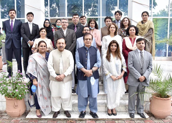 Federal Minister for Information and Broadcasting Senator Shibli Faraz’s group photo with Press Officers posted to various Pakistan embassies in Islamabad