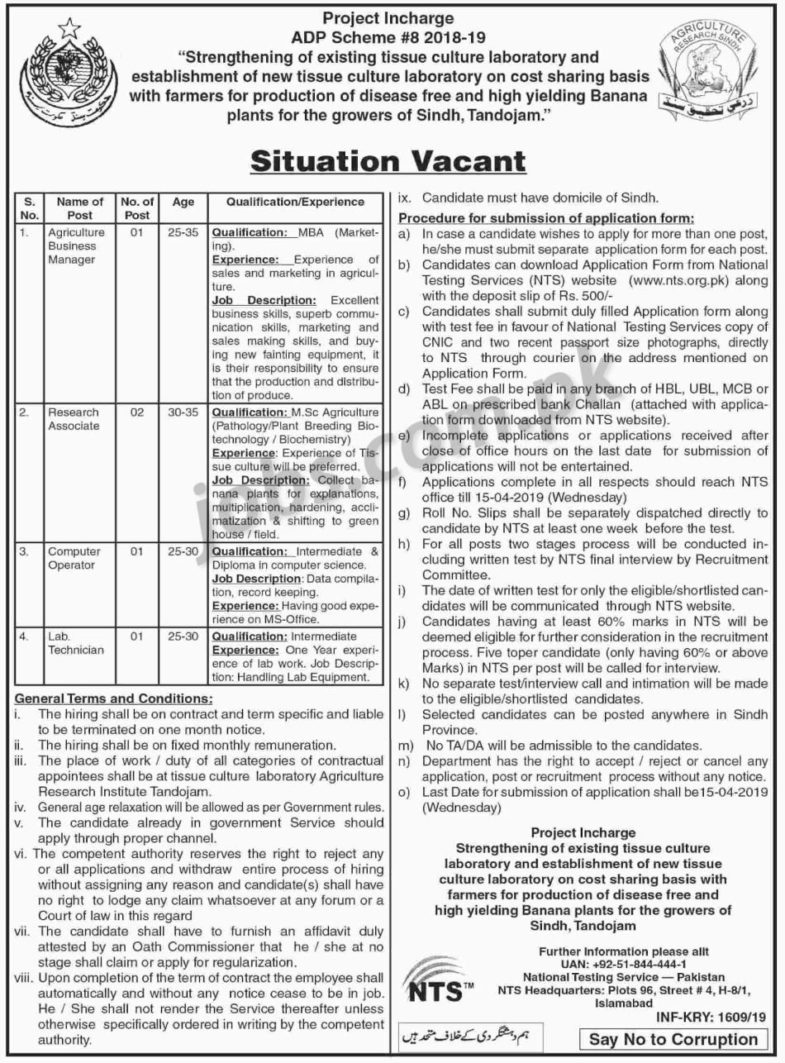Agriculture Research Sindh Jobs 2019 for 5+ Research Associates, Computer Operator, Lab Technician and Agri Business Manager to be filled immediately. NTS is conducting recruitment test for these posts and you can download the NTS application form and deposit slip from NTS website or this page below – Required qualification from a recognized institution and relevant work experience requirement are as following. Eligible candidates are encouraged to apply to the post in prescribed manner. Incomplete and late submissions/applications will not be entertained. Only short listed candidates will be invited for interview and the selection process. No TA/DA will be admissible for Test/Interview. Last date to apply to the post and submit application along with required documents is 15th April 2019.