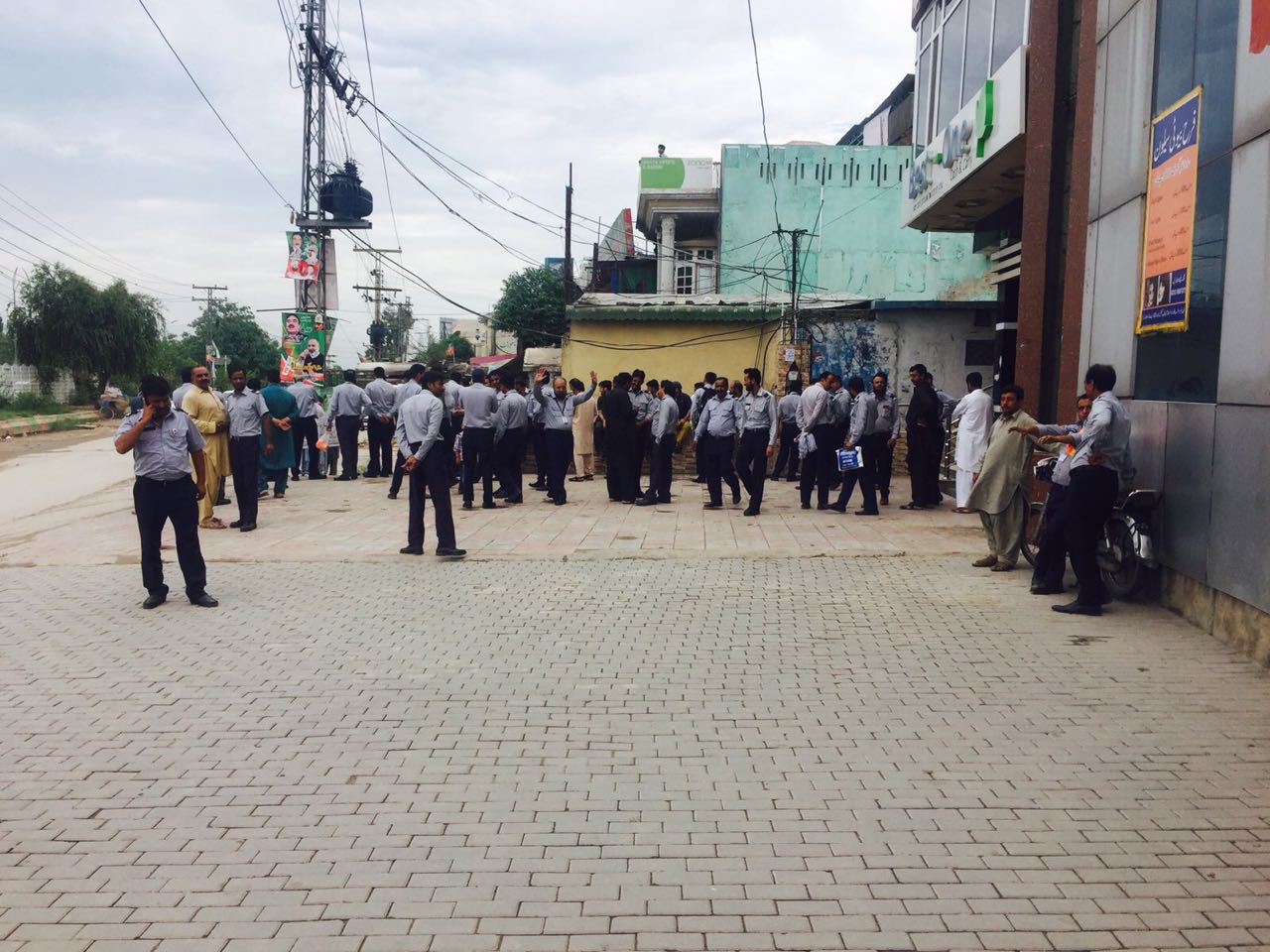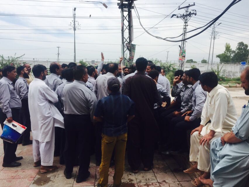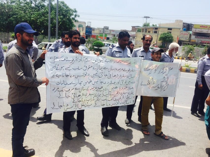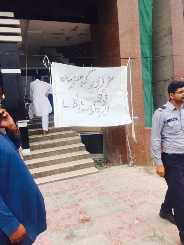 ائیر بلیو کا تمام میل سٹاف ائی ایس او ٹاور بلیو ایریا ہیڈ آفس کے باہر احتجاج۔ ملازمین کا مزدوروں کو انصاف دو کے نعرے ٹرانسپوٹ نہ ملنے اور چار سال سے تنخواہ نہ بڑھنے پر احتجاج