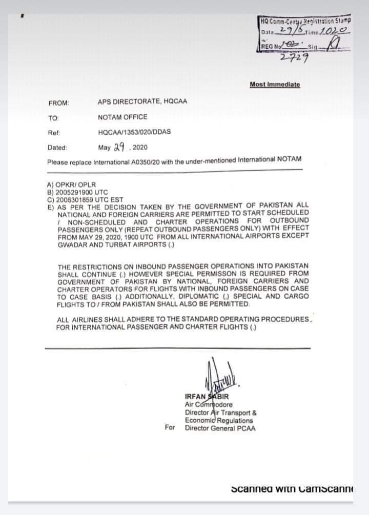حکومت پاکستان کے فیصلہ کے مطابق تمام قومی اوربین الاقوامی کیئرئرز29 مئی سے بیرونی مسافروں کیلئے گوادر کے علاوہ تمام ائرپورٹس سے شیڈولڈ، نان شیڈولڈ اورچارٹرفلائٹس شروع کرسکتے ہیں۔