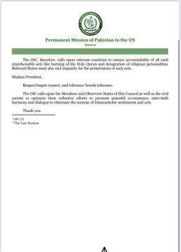 3/3: Echoed #OIC’s call upon relevant countries to ensure accountability of all such reprehensible acts like burning of the Holy Quran& denigration of religious personalities and end impunity for the perpetrators of such acts.
