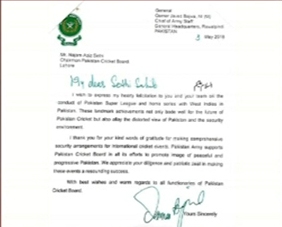 Army Chief letter with name of Chairman PCBتفصیلات کے مطابق آرمی چیف جنرل قمر جاوید باجوہ نے چیئرمین پاکستان کرکٹ بورڈ نجم سیٹھی کے لیے تعریفی خط لکھا ہے۔ جس میں آرمی چیف نے پاکستان سپر لیگ اور ویسٹ انڈیز سے سیریز پر نجم سیٹھی اور ان کی ٹیم کو مبارکباد دی ہے۔ خط میں آرمی چیف کا کہنا تھا کہ یہ نمایاں کامیابیاں پاکستان کرکٹ کے مستقبل کے لیے اہم ہیں۔ کامیابیاں سیکیورٹی صورتحال کی امیج کی بحالی کے لیے بھی اہم ہیں۔