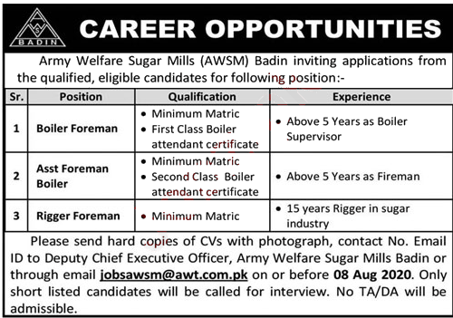 Army Welfare Sugar Mills has advertised vacancies as mentioned in below advertisement. The ad published in Jang.