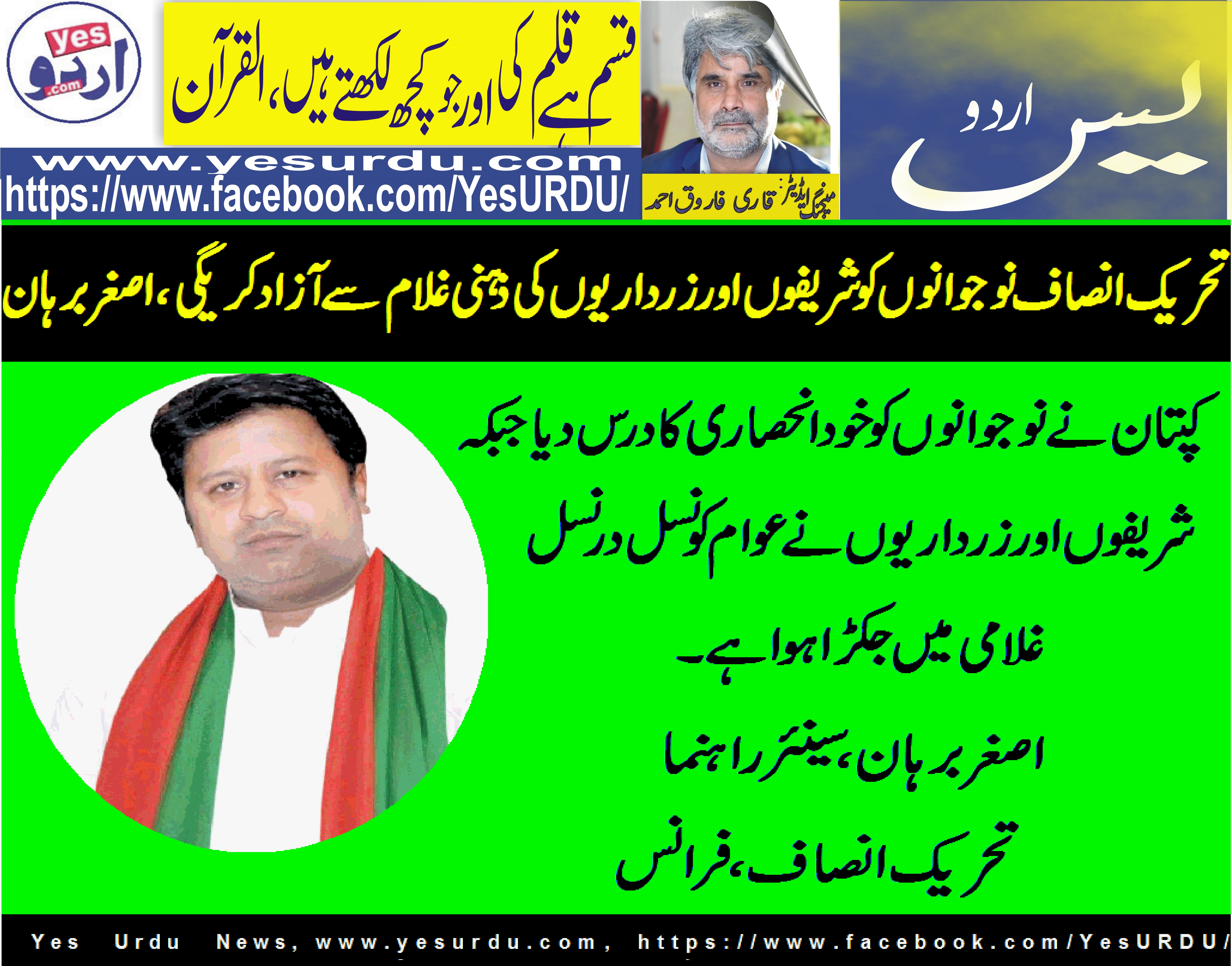 پیرس (ایس ایم حسنین)تحریک انصاف ، فرانس راہنا اصغر برہان نے اپنے بیان میں کہا ہے کہ کپتان نے نوجوانوں کو خود انحصاری کا درس دیا جبکہ شریفوں اور زرداریوں نے عوام کو نسل در نسل غلامی میں جکڑا ہوا ہے۔