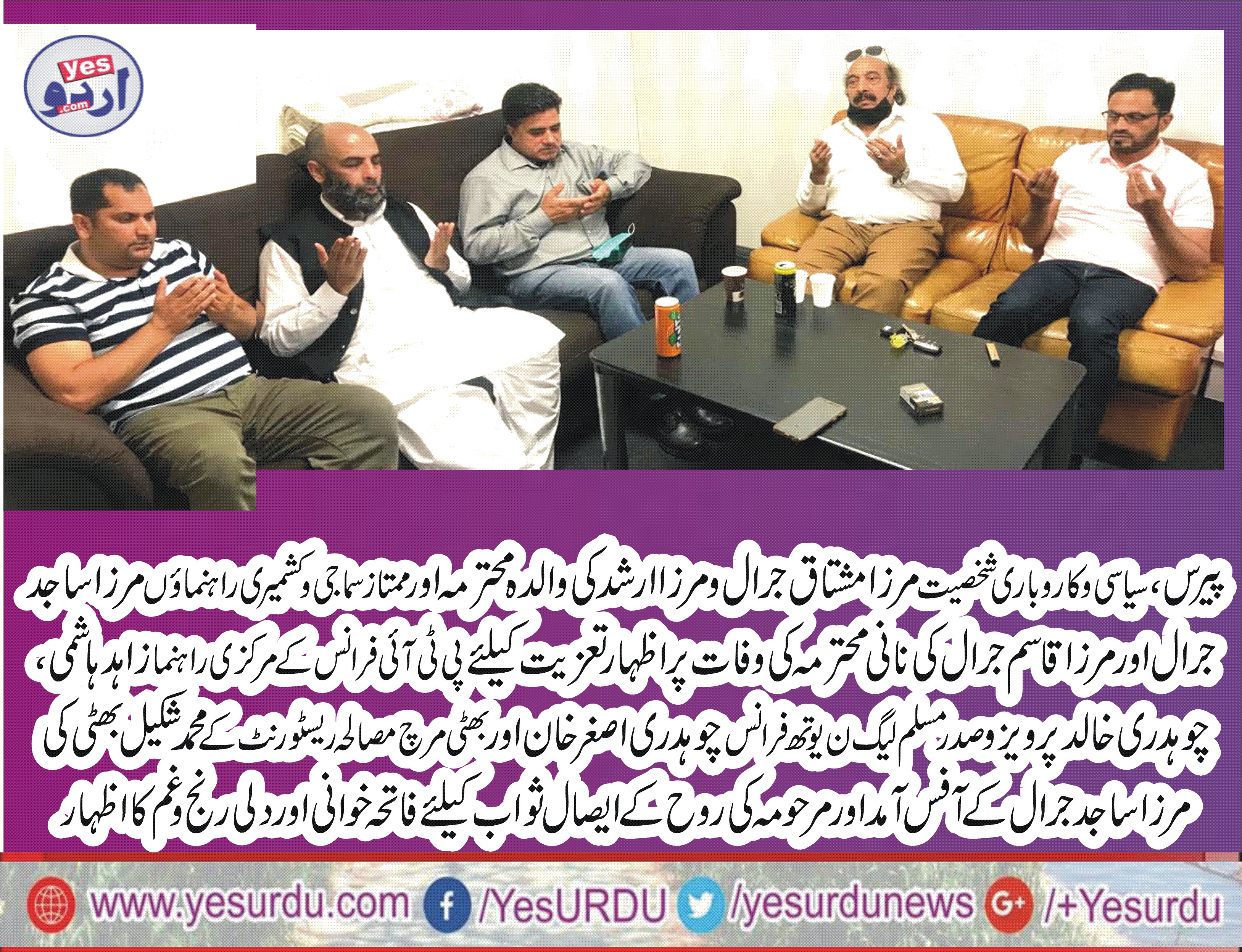 پیرس،معروف سماجی وکشمیری راہنمائوں مرزا مشتاق جرال اورارشد جرال کی والدہ اور مرزا ساجد جرال ومرزا قاسم جرال کی نانی محترمہ کے ایصال ثواب کیلئے ان کے آفس میں معروف سیاسی وسماجی شخصیات کی آمدوفاتحہ خوانی ودعا