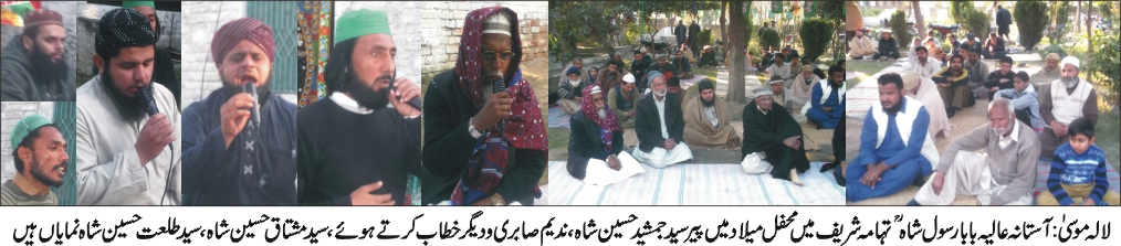 لالہ موسیٰ(جمیل احمدطاہر)آستانہ عالیہ بابارسول شاہ ؒ تہامہ شریف پر عظیم الشان محفل میلادکا اہتمام کیاگیا،محفل کی صدارت پیرسیدجمشیدحسین شاہ آستانہ عالیہ تہامہ شریف نے کی،جبکہ سیدطلعت حسین شاہ،سیدمشتاق حسین شاہ مہمان خصوصی تھے،محفل میں تلاوت قرآن پاک کے بعدمقامی ثناء خوان حضرات نے سرورکونین حضرت محمدﷺ کی بارگاہ میں ہدیہ نعت پیش کیا،پیرسیدجمشیدحسین شاہ نے خصوصی دعاکرائی ،مہمانوں کا استقبال سیدرافع حسن،سیدعامرنویدشاہ،سیدعون شاہ ودیگرسادات برادران نے کیا،جبکہ شرکاء میں سیدناصرحسین شاہ،عاطف بٹ دھامہ،میاں محمدافضل دھامہ،عثمان عزیزقادری،صحافی جمیل احمدطاہرسمیت عاشقان مصطفی اور آستانہ عالیہ تہامہ شریف کے عقیدت مندوں کی کثیرتعدادشریک تھی،محفل کے آخرمیں شرکاء کی لنگرسے تواضع کی گئی۔