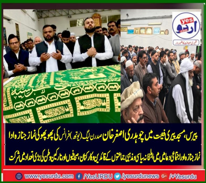 پیرس ،صدر مسلم لیگ ن یوتھ ونگ چوہدری اصغر خان کی پھوپھو جان کی نماز جنازہ مسجد پیری فیئت میں ادا کردی گئی، پیرس کی مذہبی وسیاسی جماعتوں کے سرکردہ راہنمائوں کی شرکت