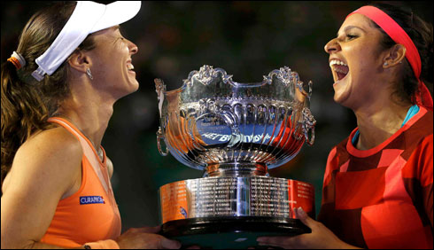 ویمنز ورلڈ نمبر ون ڈبلز پلیئرزثانیہ مرزا اور مارٹینا ہنگز کا ٹینس کورٹ میں اترنا اور کامیابیاں حاصل کرنا اب معمول بنتا جارہا ہے،دونوں خواتین کی جوڑی ٹینس کورٹ کی خطرناک جوڑی بن چکی ہے۔سال کے پہلے گرینڈ سلم آسٹریلین اوپن ڈبلز کے فائنل میںثانیہ مرزااور مارٹینا ہنگزکا مقابلہ چیک ریپبلک کی آندرے ہوواکوااور لوشی ہرادیکا سے تھا۔سوئس بھارت جوڑی نے چیک کھلاڑیوں کو کھل کر کھیلنے کا موقع ہی نہیں دیااو ر اسٹریٹ سیٹ میں کامیابی حاصل کرتےہوئے آسٹریلین اوپن ڈبلز ایونٹ کی ٹرافی اپنے نام کرلی،ان کی جیت کا اسکور سات چھ اور چھ تین رہا۔