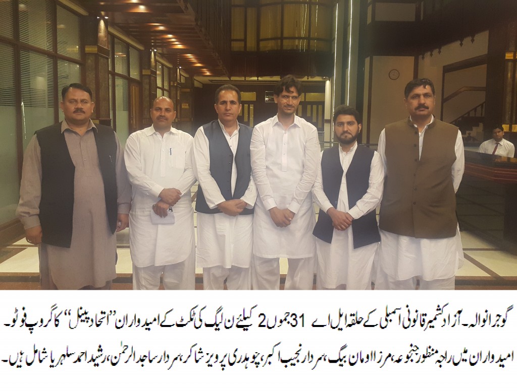 گوجرانوالہ (پریس ریلیز) آزاد کشمیر قانون ساز اسمبلی کے آنیوالے انتخابات کیلئے گوجرانوالہ کے حلقہ ایل اے 31 جموں 2 سے ن لیگ کی ٹکٹ کے سات امیدواروں مرزا اومان بیگ، راجہ منظور جنجوعہ، رشید احمد سلہریا، چوہدری پرویز شاکر، سردار نجیب اکبر،ثمر سبحانی اور سردار ساجد الرحمن کا ایک اہم اجلاس گذشتہ روز پرل رچنا ہوٹل میں منعقد ہوا جس میں متفقہ طورپر سات امیدواران کا پینل بنانے کا اعلان کیا گیا۔