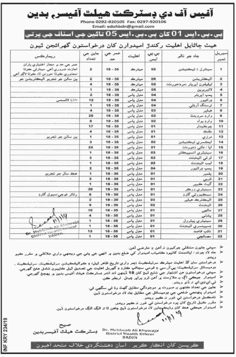 Badin District Health Office Jobs 2019 for 200+ Posts (Multiple Categories)