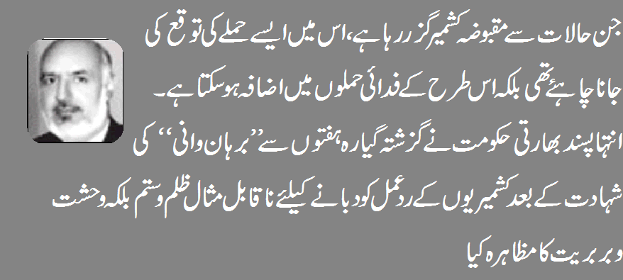 جن حالات سے مقبوضہ کشمیر ان دنوں گزر رہا ہے، اس میں ایسے حملے کی توقع کی جانا چاہئے تھی بلکہ اس طرح کے فدائی حملوں میں اضافہ ہو سکتا ہے۔ انتہاپسند بھارتی حکومت نے گزشتہ گیارہ ہفتوں سے ’’برہان وانی‘‘ کی شہادت کے بعد کشمیریوں کے ردعمل کو دبانے کیلئے جو ناقابل مثال ظلم و ستم بلکہ وحشت وبربریت کا مظاہرہ کیا، کشمیر کی مسلمان آبادیوں کے خون سے ہولی کھیلی، ان کے نوعمر نہتے بچوں پر چھرے کی بندوقوں سے حملہ کرکے ہزاروں کی تعداد کو ساری عمر کیلئے اندھا اور معذور بنا ڈالا۔77 دنوں سے کرفیو کی وجہ سے سارے لوگ بے آب و دانہ گھروں میں محصور کر دیئے گئے ہیں جن کے پاس کھانے کو روٹی نہ پینے کو پانی، بچوں کیلئے دودھ نہ بوڑھوں کیلئے غذا، سکول جانے کا موقع، نہ ہسپتال تک رسائی۔ تو ان حالات میں جوان خون جس میں غیرت کا عنصر بھی ہے، یہ سب کچھ ٹھنڈے پیٹوں برداشت نہیں کر سکتا، وہ دشمن کو ساتھ لے کر جان سے گزر جانے کو ذلت و بے بسی کی زندگی پر ترجیح دے گا۔ بھارتی بریگیڈ ہیڈکوارٹر پر یہ حملہ ان پیداکردہ حالات کا نتیجہ ہے جو انتہاپسند مودی سرکار اور اس کی فوج نے پیدا کر رکھے ہیں، ان حالات کو بدلا نہ گیا تو یہ پرامن سیاسی تحریک ایک مرتبہ پھر انتہا اور تشدد کا راستہ اختیار کر لے گی اور اب کے بار بھارتی سرکار کو لینے کے دینے پڑ جائیں گے کہ ’’چند دنوں میں بھارتی سورمائوں نے ہر گھر میں صف ماتم کا اہتمام کر ڈالا ہے، کون سا گھر ہے جہاں شہید کا لاشہ نہیں اٹھایا گیا یا ایک نابینا معذور چارپائی سے نہیں لگ گیا یا کسی نیم روشن کونے میں عصمت و عفت کی بے گور و کفن لاش نہ رکھی ہو۔