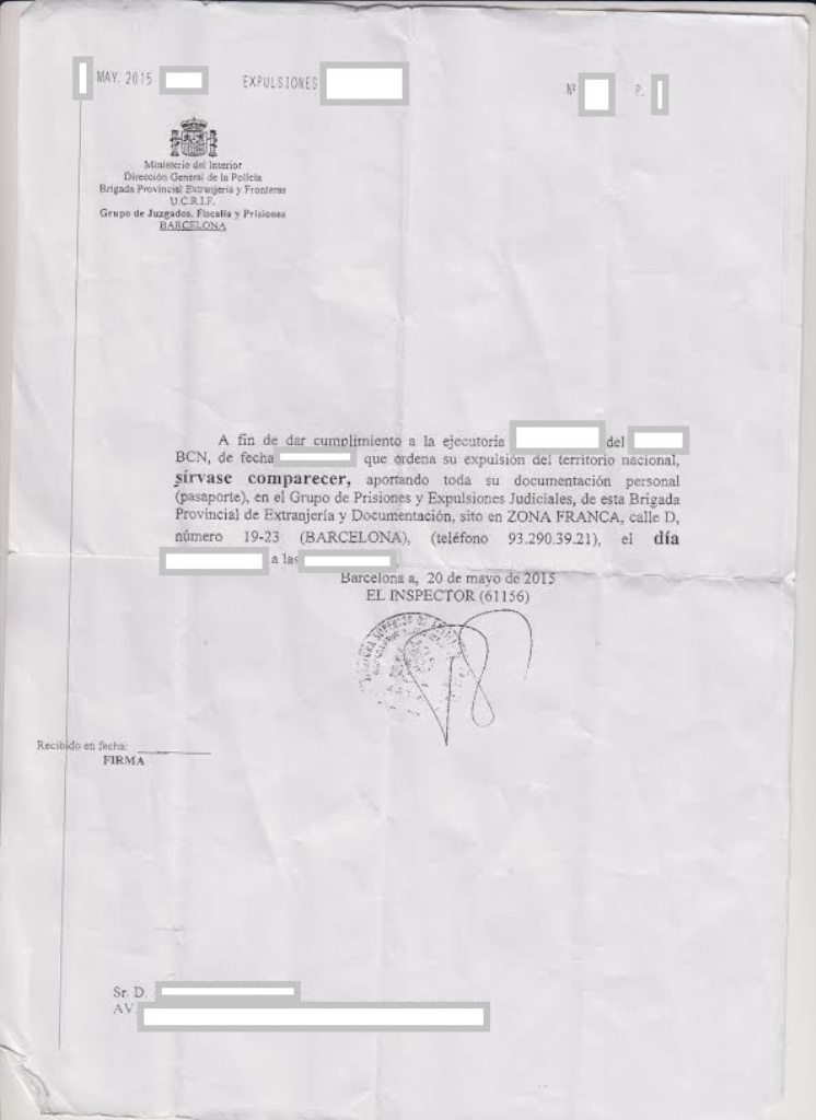 اس وجہ سے پولیس اہلکار علاقہ میں موجود تمام پاکستانیوں کو شک کی نگاہ سے دیکھتے ہیں۔ اور شاید اسی وجہ سے اسے ڈیپورٹ آرڈر دیا گیا ہے۔ پاکستانی کے ایک دوست نے پاک فیڈریشن سپین کے ترجمان سعد مختار تارڑ سے اس کا ٹیلیفونک رابطہ کروایا۔ جنہوں نے اس کا کیس ڈیپورٹیشن معملات کے ماہر وکیل آندریس گاریسا کو بوساطت ایمیگرینٹس دوست سیاسی پارتی آئی سی وی کو ارسال کر دیا۔