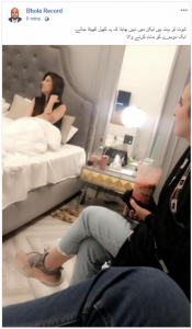 لاہور (ویب ڈیسک) متنازعہ سوشل میڈیا سٹار بھولا ریکارڈ نے ایک اور متنازعہ شخصیت حریم شاہ کی نئی تصویر فیس بک پر شیئر کی ہے۔بھولا ریکارڈ کی جانب سے شیئر کی جانے والی تصویر کسی ہوٹل کے بیڈ روم کی ہے جس میں ایک خاتون کو بیڈ پر بیٹھے ہوئے دیکھا جاسکتا ہے۔ اس تصویر میں حریم شاہ