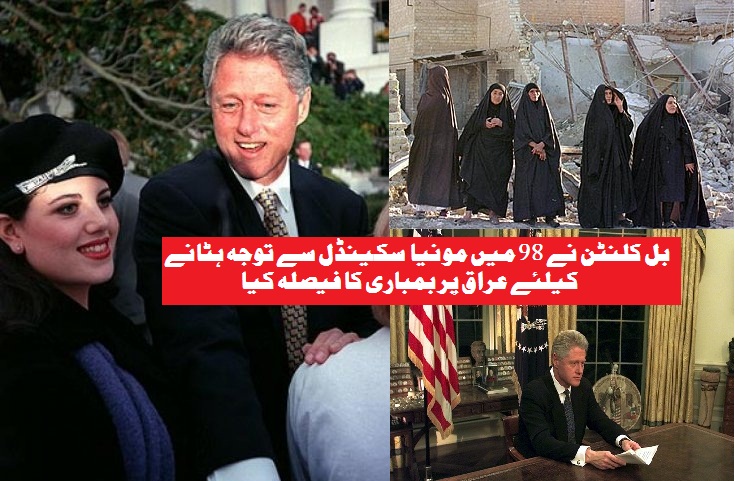 مضمون کے مطابق 1996اور1998میں بھی عراق پر بمباری کی گئی۔عراق بحران نے بل کلنٹن کو فائدہ پہنچایا جو اس وقت ذاتی بحرانوں کا شکار تھے جن میںان کی مہم فنڈنگ سکینڈلز، قانون سازی کی ناکامی اور مونیکا لیونسکی معاشقہ شامل تھے۔ بل کلنٹن کے مواخذے کے مقدمے کی سماعت کے عروج کے وقت انہوں چار دن تک 1998میں عراق پر بموں اور کروز میزائلوں سے حملے کیے جس کا مقصد مونیکا معاشقے سے توجہ ہٹانا تھا ،جارج بش نے عراق پر دوبارہ حملے کا جواز بل کلنٹن کے انہیں حملوںکو بنایا۔