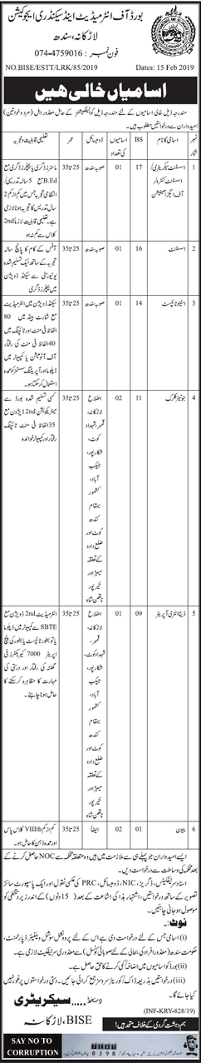 BISE Larkana Jobs 2019 for 8+ Jr Clerks, Stenotypists, Assistant, DEO & Other Posts (Disable Quota)23 February, 2019 Post Views - پوسٹ کو دیکھا گیا: 66