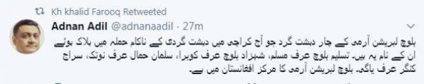 عدنان عادل نے لکھا کہ “بلوچ لبریشن آرمی کے چار دہشت گرد جو آج کراچی میں دہشت گردی کے ناکام حملہ میں ہلاک ہوئے ان کے نام یہ ہیں۔ تسلیم بلوچ عرف مسلم، شہزاد بلوچ عرف کوبرا، سلمان حمال عرف نوتک، سراج کنگر عرف یاگی۔ بلوچ لبریشن آرمی کا مرکز افغانستان میں ہے”۔