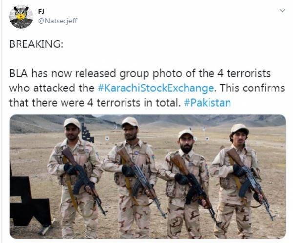 سوشل میڈیا پر تصاویر شیئرکرنے کیساتھ ہی لکھا گیا ہے کہ کراچی سٹاک ایکسچینج پر حملہ کرنیوالے چاروں افراد کی اب بی ایل اے نے تصاویر جاری کردی ہیں ، اس سے یہ بھی ثابت ہوتا ہے کہ وہاں حملہ کرنیوالے افراد کی کل تعداد ہی چار تھی ۔