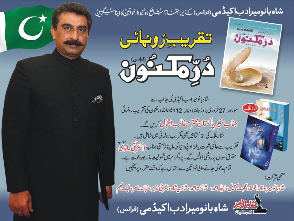 فرانس (شاہ بانو میر) ادب اکیڈمی کی جانب سے شائع ہونے والے میگزین”” درمکنون”” کی تقریب رونمائی جناب سفیر پاکستان محترم غالب اقبال صاحب انشاءاللہ 27 فروری کوایک باوقار پروگرام میں کریں گے . شاز ملک (فرانس) کی دو ،کتابیں بھی تقریب رونمائی میں شامل ہیں .