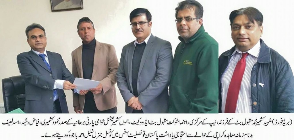 بریڈ فورڈ (تیمور لون) شہید کشمیر محمد مقبول بٹ کے فرزند، نیپ کے مرکزی راہنما شوکت مقبول بٹ ایڈووکیٹ، جموں کشمیر نیشنل عوامی پارٹی برطانیہ کے صدر محمود کشمیری، فیاض رشید، اسد لطیف بدنام زمانہ معاہدہ کراچی کے حوالے سے احتجاجی یاداشت پاکستان قونصلیٹ آفس میں کونسل جنرل خلیل احمد باجوہ کو دیتے ہوئے۔