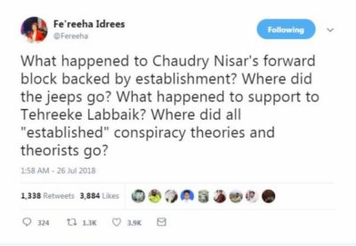 لاہور: عام انتخابات کے تاحال نتائج آنے کا سلسلہ جاری ہے جبکہ اب تک موصول ہونے والے نتائج کے مطابق پاکستان تحریک انصاف 109 نشستوں کے ساتھ پہلے نمبر پر ہے جبکہ ن لیگ 62 کے ساتھ دوسری پوزیشن پر تاہم انتہائی حیران کن طور کچھ ایسے نتائج بھی آئے ہیں جس کے بارے میں سن کر ہی ہر کوئی حیران ہے ۔صحافی فریحہ ادریس نے ٹویٹر پر الیکشن سے قبل چلنے والی افواہوں پر سوالات اٹھاتے ہوئے ٹویٹ کیا ہے جس میں ان کا کہناتھا کہ ” کیا کوئی بتا سکتاہے کہ چوہدری نثار کے فارورڈ بلاک کو کیا ہوا جسے اسٹبلشمنٹ کی حمایت حاصل تھی ، جیپیں کہاں چلی گئیں ، تحریک لبیک کو ملنے والی سپورٹ کا کیا بنا، تمام سازشی نظریات اور نظریے والے کہاں گئے ؟یہاں یہ امر بھی قابل ذکر ہے کہ تحریک لبیک پاکستان نے پنجاب سے ایک اور سندھ سے دو صوبائی نشستوں پر کامیابی حاصل کر لی ہے جبکہ چوہدری نثار بھی اپنے دونوں قومی اسمبلی اور ایک صوبائی اسمبلی کی سیٹ سے ہار گئے ہیں جبکہ وہ صرف ایک صوبائی اسمبلی پر کامیابی حاصل کر سکے ہیں ۔ جبکہ انکی جانب سے دعویٰ کیا گیا تھا کہ وہ (ن) لیگ اور تحریک انصاف دونوں جماعتوں کو شکست دیں گے۔