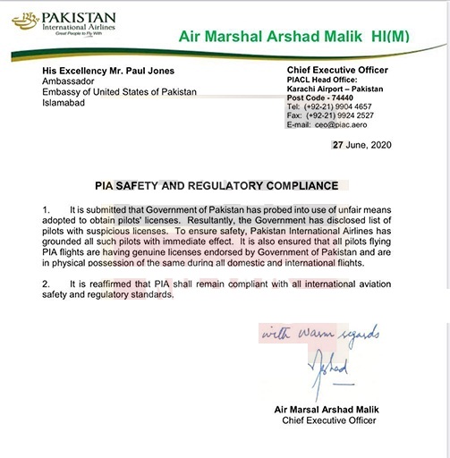 ایئر مارشل ارشد ملک نے لکھا کہ مسافروں اور جہازوں کی سیفٹی کے لیے مشکوک لائسنس والے پائلٹس کو گراؤنڈ کر دیا گیا ہے، حکومتِ پاکستان جعلی لائسنس کے معاملے کی مکمل چھان بین کرے گی۔