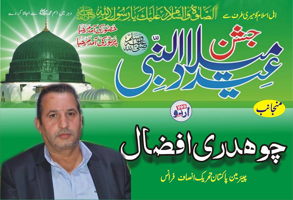 چوہدری افضال چیئرمین پاکستان تحریک انصاف فرانس کی طرف سے عید میلاد النبی کا اشتہارچوہدری افضال چیئرمین پاکستان تحریک انصاف فرانس Post Views - پوسٹ کو دیکھا گیا: 156