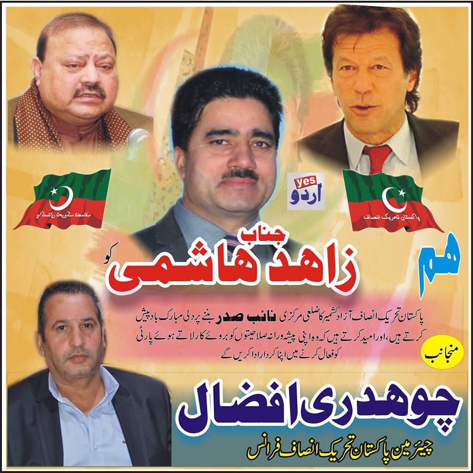 چیئرمین پاکستان تحریک انصاف فرانس چوہدری افضال جناب زاہد ہاشمی کو پاکستان تحریک انصاف آزاد کشمیر کا ضلعی مرکزی نائب صدر بننے پر مبارکباد پیش کرتے ہیں۔