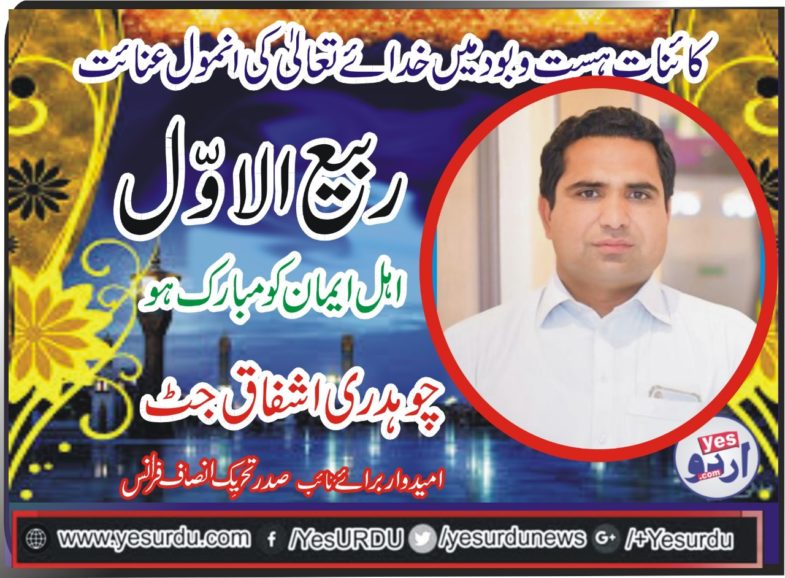 تحریک انصاف فرانس کے نامزد نائب صدر چوہدری اشفاق جٹ کی طرف سے تمام اہل ایمان خصوصاً اہل وطن اوردوستوں عزیزواقارب کو ربیع الاول کی مبارک آمد اوررحمت العالمین حضرت محمد ﷺ کی ولادت کی مبارکباد