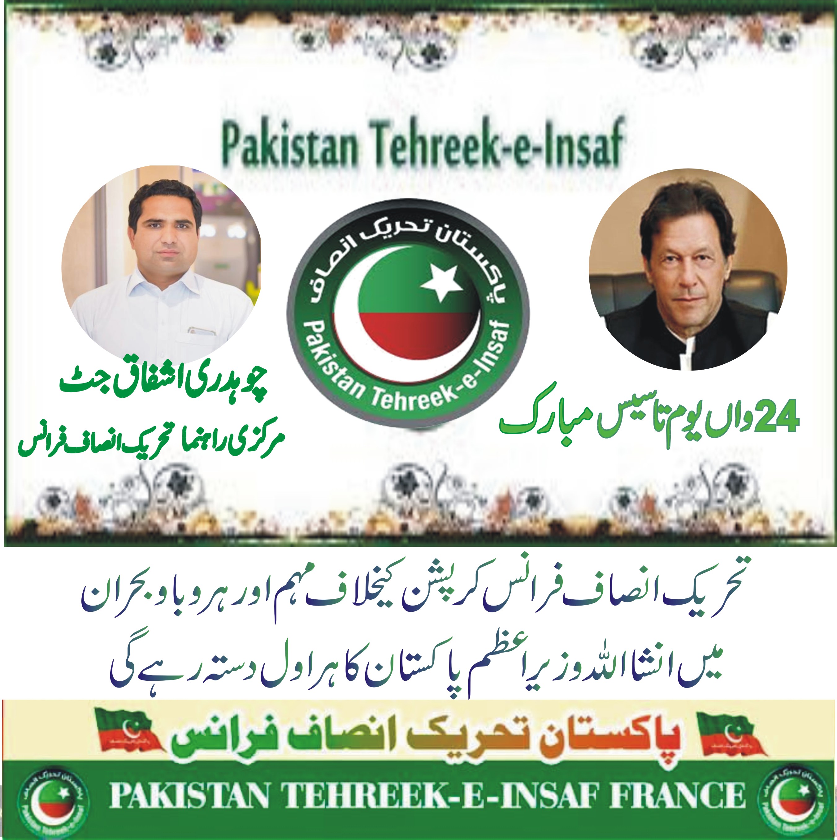 پیرس؍اسلام آباد(ایس ایم حسنین) پاکستان تحریک انصاف فرانس کے مرکزی راہنما چوہدری اشفاق جٹ نے پی ٹی آئی کے 24ویں یوم تاسیس پر مرکزی قیادت اورپوری پاکستانی قوم کو مبارکباد پیش کرتے ہوئے کہا ہے کہ وزیراعظم پاکستان جناب عمران خان جیسے مدبر اور دیانتدار سیاستدان پرپوری قوم فخر کرتی ہے۔ انھوں نے کہا کہ تحریک انصاف فرانس کے تمام کارکنا ہر طرح کے حالات اور ہر وبا کا مقابلہ کرنے کیلئے اور کرپٹ سیاستدانوں کیخلاف جہاد میں وزیراعظم عمران خان کا ہراول دستہ رہیں گے اورانشااللہ اب کرپٹ سیاستدانوں کیلئے پاکستان کی سیاست میں کوئی جگہ نہیں رہیگی۔