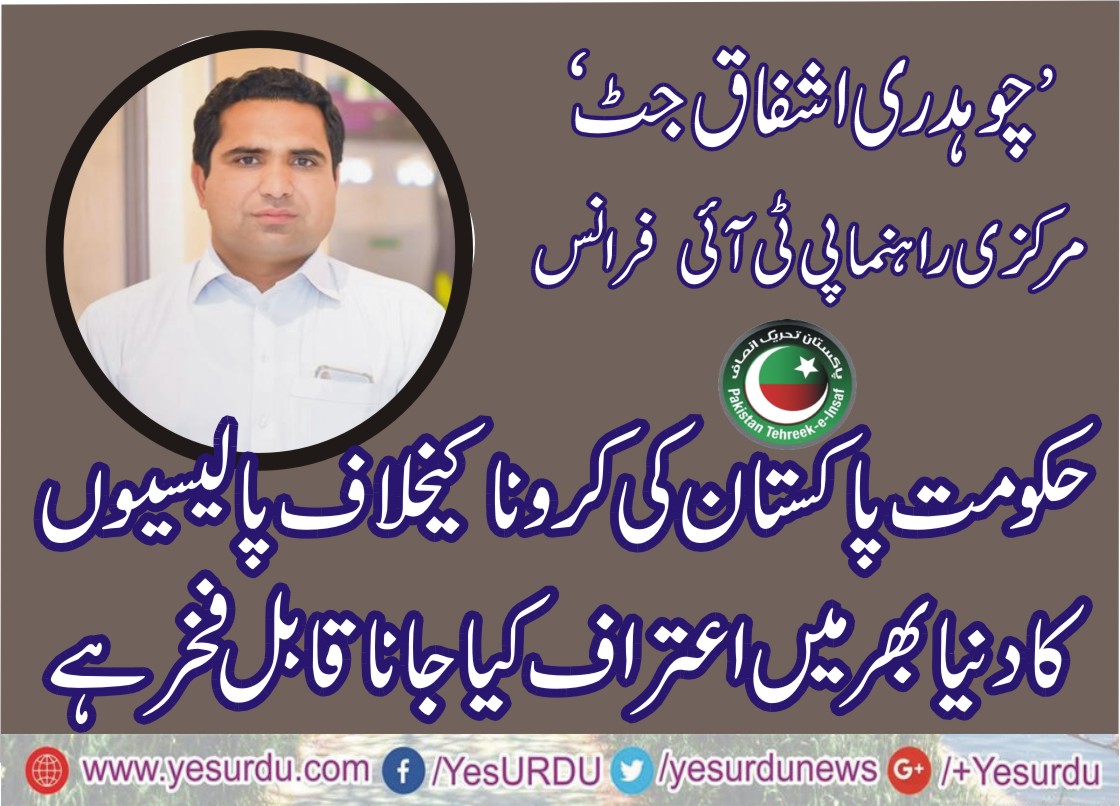 پیرس؍اسلام آباد(ایس ایم حسنین) پاکستان تحریک انصاف فرانس کے مرکزی راہنما چوہدری اشفاق احمد جٹ نے وزیراعظم پاکستان کو خراج تحسین پیش کرتے ہوئے کہا ہے کہ اوآئی سی، اقوام متحدہ اورعالمی ادارہ صحت نے یک زبان ہوکر وزیراعظم عمران خان کی پالیسیوں کی تعریف اور انھیں اپنانے کا عندیہ دیا ہے۔ ان کا کہنا تھا کہ اس سے قبل پاکستان میں یہ ویژن خال خال ہی نظرآتا تھا جبکہ وزیراعظم عمران خان پر اللہ کا خاص کرم ہے کہ وہ پاکستان اور پاکستانی عوام کے ساتھ والہانہ محبت کا اظہار کرتے ہوئے جو بھی قدم اٹھاتے ہیں اللہ تعالیٰ انھیں سرخرو کرتے ہیں۔