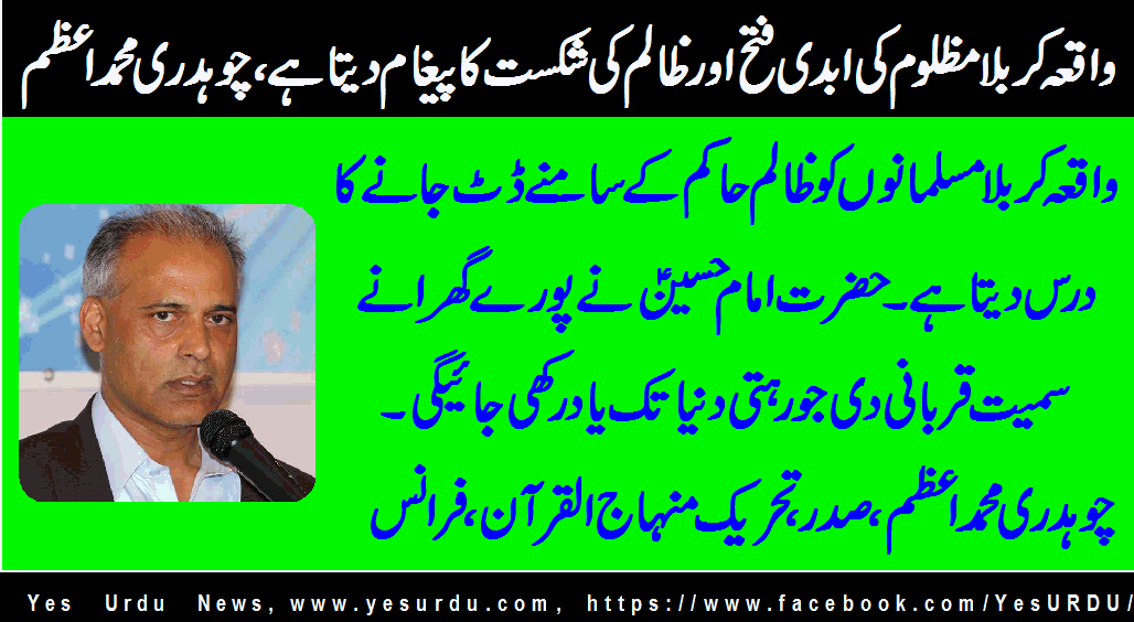 پیرس(ایس ایم حسنین) صدر تحریک منہاج القرآن فرانس، چوہدری محمد اعظم نے محرم الحرام کے حوالے سے تحریک کی طرف سے جاری ایک اعلامیہ میں کہا ہے کہ واقعہ کربلامظلوم کی ابدی فتح اور ظالم کی شکست کا پیغام دیتا ہےواقعہ کربلا مسلمانوں کو ظالم حاکم کے سامنے ڈٹ جانے کا درس دیتا ہے ۔حضرت امام حسینؑ نے پورے گھرانے سمیت قربانی دی جو رہتی دنیا تک یاد رکھی جائیگی۔