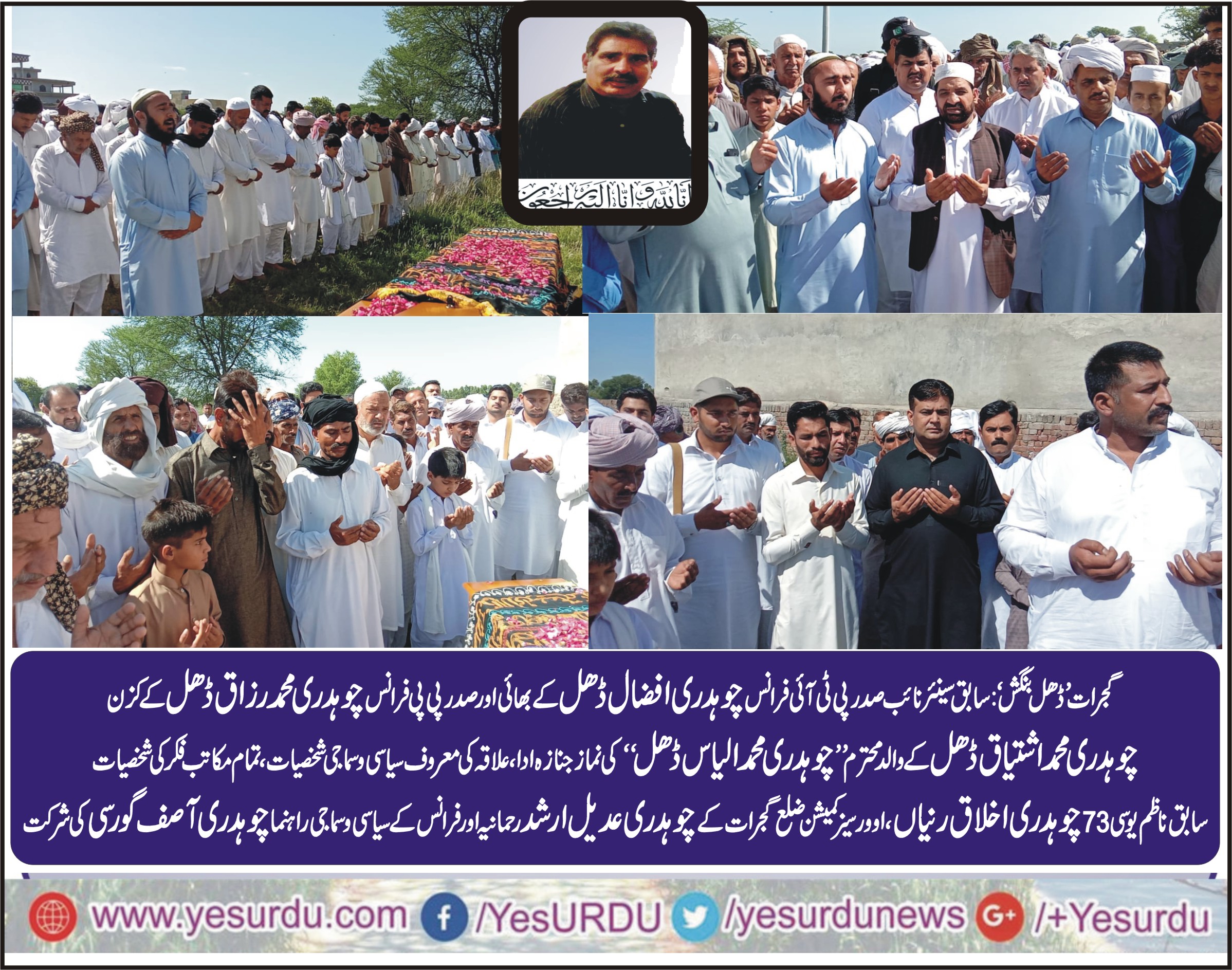 چوہدری محمد افضال ڈھل سینئر نائب صدر پی ٹی آئی فرانس کے بڑے بھائی صدر پیپلز پارٹی فرانس چوہدری محمد رزاق ڈھل کے کزن اورچوہدری اشتیاق ڈھل کی والد محترم چوہدری الیاس ڈھل بنگش مرحوم کی نماز جنازہ ڈھل بنگش گجرات میں ادا کی گئی، معززین علاقہ، معروف شخصیات کی شرکت