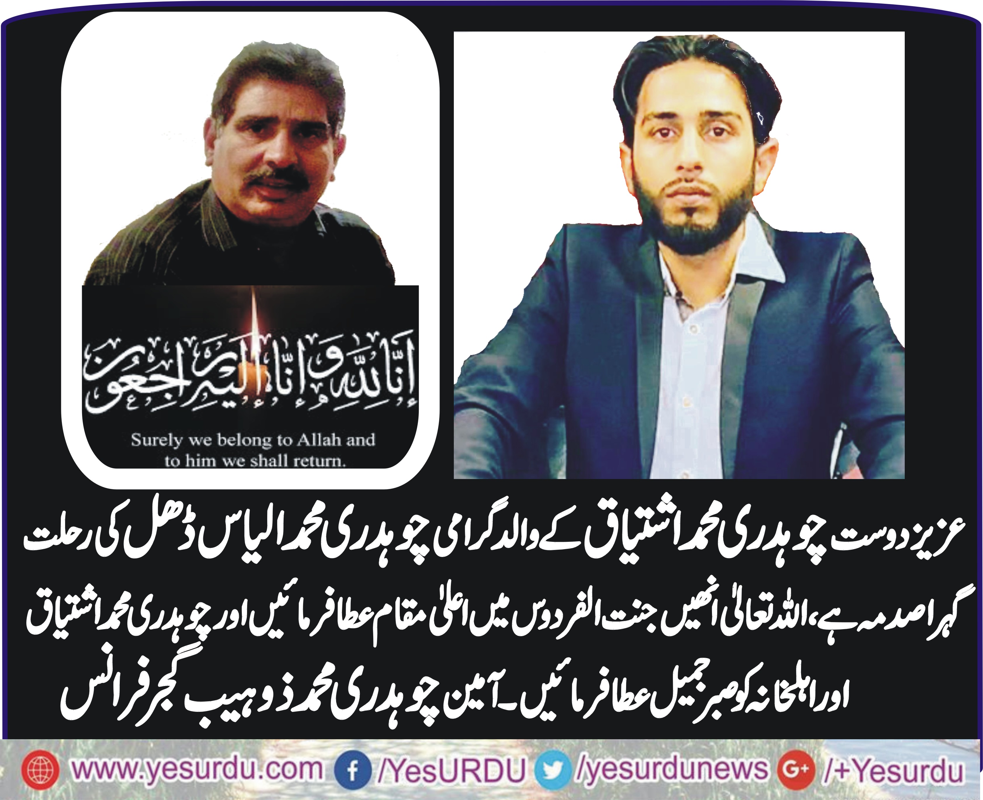 پیرس، چوہدری محمد اشتیاق کے والد گرامی اور سابق سینئر نائب صدر تحریک انصاف فرانس چوہدری محمد افضال ڈھل کے بھائی اور پی پی فرانس کے صدر چوہدری محمد رزاق ڈھل کے کزن چوہدری محمد الیاس ڈھل کی وفات گہرا صدمہ ہے، رمضان المبارک کے مقدس ساعتوں کو اللہ تعالیٰ ان کی بخشش کا سبب بنادیں، محمد ذوہیب گجر