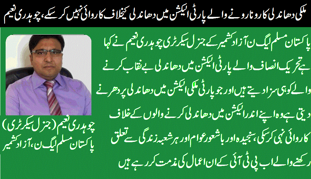 پاکستان مسلم لیگ ن آزاد کشمیر کے جنرل سیکرٹری چوہدری نعیم نے کہا ہے تحریک انصاف والے پارٹی الیکشن میں دھاندلی بے نقاب کرنے والے کو ہی سزا دیتے ہیں اورجو پارٹی ملکی الیکشن میں دھاندلی پر دھرنے دیتی ہے وہ اپنے اندر الیکشن میں دھاندلی کرنے والوں کے خلا ف کاروائی نہی کر سکی،سنجیدہ اور باشعور عوام اور ہرشعبہ زندگی سے تعلق رکھنے والے اب پی ٹی آئی کے ان اعمال کی مذمت کر رہے ہیں