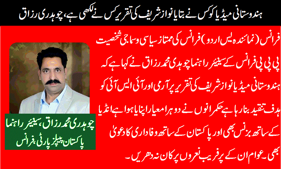 فرانس(نمائندہ یس اردو) فرانس کی ممتاز سیاسی وسماجی شخصیت پی پی پی فرانس کے سینیئر راہنما چوہدی محمد رزاق نے کہا ہے کہ ہندوستانی میڈیا نواز شریف کی تقریرپر آرمی اور آئی ایس آئی کو ہدف تنقید بنارہا ہے حکمرانوں نے دوہرا معیار اپنایا ہوا ہے انڈیا کے ساتھ بزنس بھی اور پاکستان کے ساتھ وفاداری کا دعویٰ بھی۔ عوام ان کے پرفریب نعروں پرکان نہ دھریں۔
