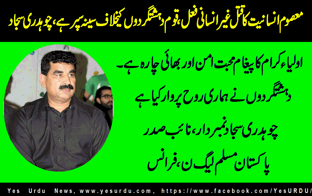 پیرس( یس اردو نیوز)پاکستان مسلم لیگ ن فرانس کے نائب صدر جنا بچوہدری سجاد نمبر دار نے کہا ہے کہ اولیائ کرام کا پیغام محب امن اور بھائی چارہ ہے دہشتگردوں نے ہماری روح پر وار کیا ہے۔ انہوں نے دہشتتگردی کے واقعے کی شدید مذمت کرتے ہوئے کہا ہے کہ معصوم انسانیت کا قتل غیر انسانی فعل ہے، قوم ان دہشتگردوں کو کبھی معاف نہیں کرےگی۔ اور ان کے خلاف ہمیشہ سینہ سپر رہے گی۔