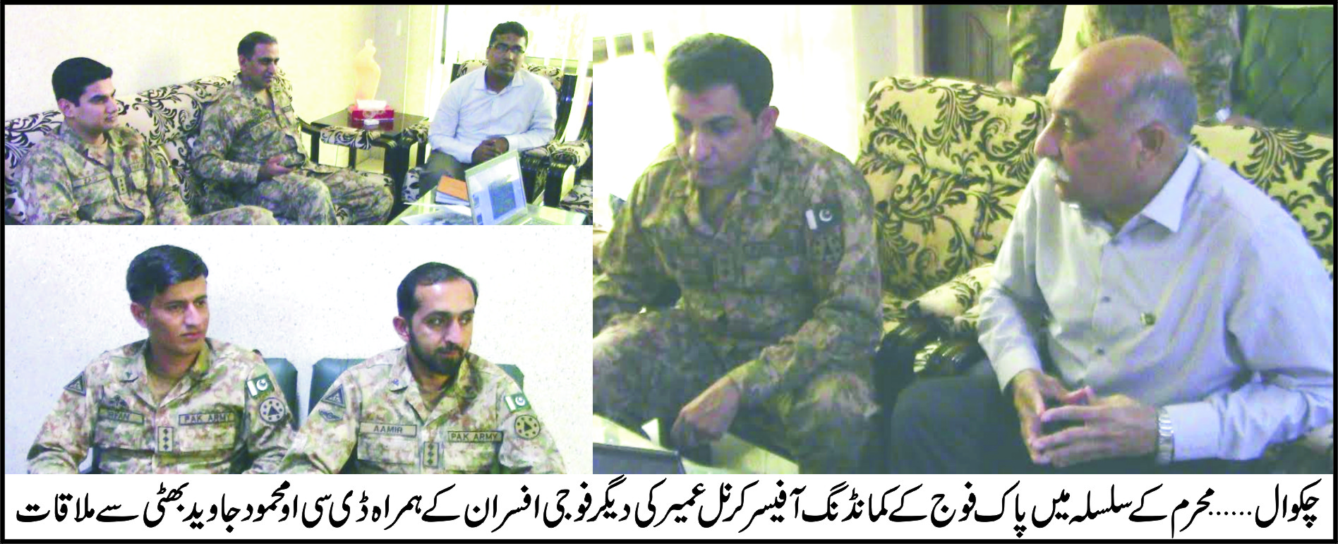 چکوال (نمائندہ یس اردو نیوز)محرم کے دوران امن و امان قائم رکھنے کیلئے پاک فوج کے کمانڈگ آفیسر کرنل عمیر کی دیگر افسران کے ہمراہ ڈی سی او محمود جاوید بھٹی سے ملاقات ہوئی جس میں سیکورٹی صورتحال پر تبادلہ خیال کیا گیا۔اس موقع پر اس امر کا اظہار کیا گیا کہ ضلعی انتظامیہ اور پولیس نے تمام انتظامات مکمل کر لیے ہیں۔ حساس جلوسوں کو اے کیٹاگری میں رکھا گیا ہے جہاں پر فول پروف سیکورٹی انتظامات کیے گئے ہیں۔ پیر کے روز پاکستان آرمی کھاریاں کے کمانڈنگ آفیسر محمد عمیر اور دیگر فوجی افسران نے ضلعی انتظامیہ کے ساتھ اعلیٰ سطح کے اجلاس میں شرکت کی۔ جس میں ڈی سی او چکوال محمود جاوید بھٹی، اے ڈی سی عاصم جاوید ہاشمی نے شرکت کی۔ اجلاس میں طے پایا کہ محرم کے دوران کسی قسم کی ناخوشگوار صورتحال سے نبٹنے کیلئے پانچ محرم کی شام کو پاک فوج کے دستے کھاریاں سے چکوال پہنچیں گے اور وہ دس محرم تک ضلع چکوال میں موجود رہیں گے۔ ڈی سی او محمود جاوید بھٹی نے بتایا کہ فوج ضلعی انتظامیہ کی ہنگامی امداد کیلئے اس دوران ہر وقت ضلع میں موجود ہوگی۔