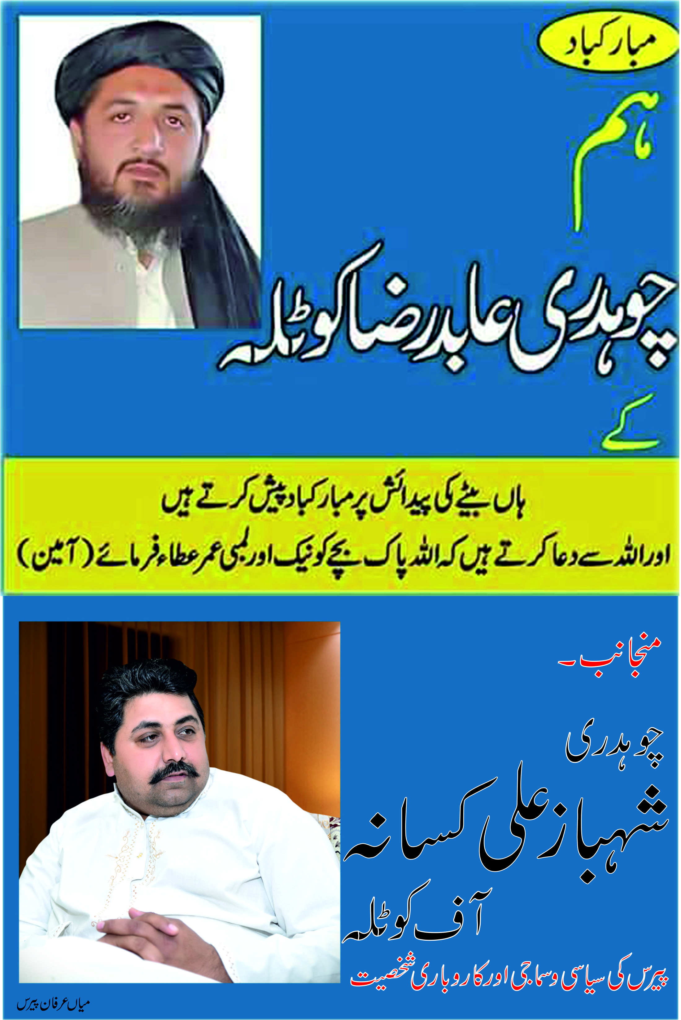پیرس (میاں عرفان صدیق) ہم چوہدری عابد رضا کوٹلہ کے ہاں بیٹے کی پیدائش پر مبارکباد پیش کرتے ہیں، شہباز علی کسانہ۔