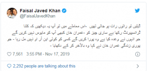عمران خان نے کہا ہے ، وہ کرکے دکھایا ہے ۔ ہم نے عمران خان کی قیادت میں ملک کو آگے لے کر جانا ہے ، ڈیلیں تو راتوں رات ہوجاتی تھیں ۔ نوازشریف کے معاملے میں تو ہر چیز کوشفاف رکھا گیا ہے ۔ انہوں نے کہا کہ حکومت نے یہ کہا کہ نواز شریف ضمانت دیئے بغیر باہر نہیں جاسکتے اورعدالت نے زیادہ سخت شرائط عائد کردیں۔ انہوں نے کہا کہ عمران خان کبھی مایوس نہیں کریں گے جووعدہ کیا ہے ، وہ پورا کریں گے ۔ اس سے قبل انہوں نے بلاول بھٹو کے بیان پر تنقید کرتے ہوئے کہا کہ سلیکشن کے حوالے سے اپنی پارٹی کا ذرا ٹریک ریکارڈ چیک کرلیں ۔ سینیٹر فیصل جاوید خان نے اپنے ٹویتر پیغام میں کہا کہ ’’تبدیلی توپسند آئی ہے، آپ نے رومن اردو لکھنا سیکھ لیا ہے،لگے رہیں۔ آپ کو بار بار لانچ کرنےکی کوششوں میں مسلسل ناکامی ہو رہی ہے۔ سلیکشن کے حوالے سے اپنی پارٹی کاذرا ٹریک ریکارڈ چیک کرلیں کہ انہوں نے کیسے سٹارٹ لیا اور آپ پرچی پر کیسے آئے۔ عمران خان تو بائیس سال جدوجہد کرنے کے بعد عوام کی نمبر ون چوائس ہیں‘‘۔ یاد رہے کہ چئیرمین پاکستان پیپلز پارٹی بلاول بھٹو زرداری نے طنزکرتے ہوئے سوال کیا تھا کہ سلیکٹڈ کو جنہوں نے سلیکٹ کیا ہے کیا انہیں تبدیلی پسند آئی ہے؟ انہوں نے وزیراعظم عمران خان کو مخطاب کرتے ہوئے کہا کہ سلیکٹڈ سے بھی پوچھتا ہوں کیا امپائر کی انگلی پسند آئی؟ چئیرمین پاکستان پیپلز پارٹی نے اپنے ٹویٹر پیغام میں کہا ہے کہ مین میرا سوال آج بھی وہی ہے کہ کیا تبدیلی پسند آئی۔ انہوں نے مزید کہا کہ اب نہ امپائے کی انگلی چلے گی نی جعلی تبدیلی بلکہ اب صرف اور صرف عوام کی مرضی چلے گی۔ بلاول بھٹو زرداری نے ہیش ٹیگ گیم اوور سلیکٹڈ بھی لکھ کر شئیر کیا۔