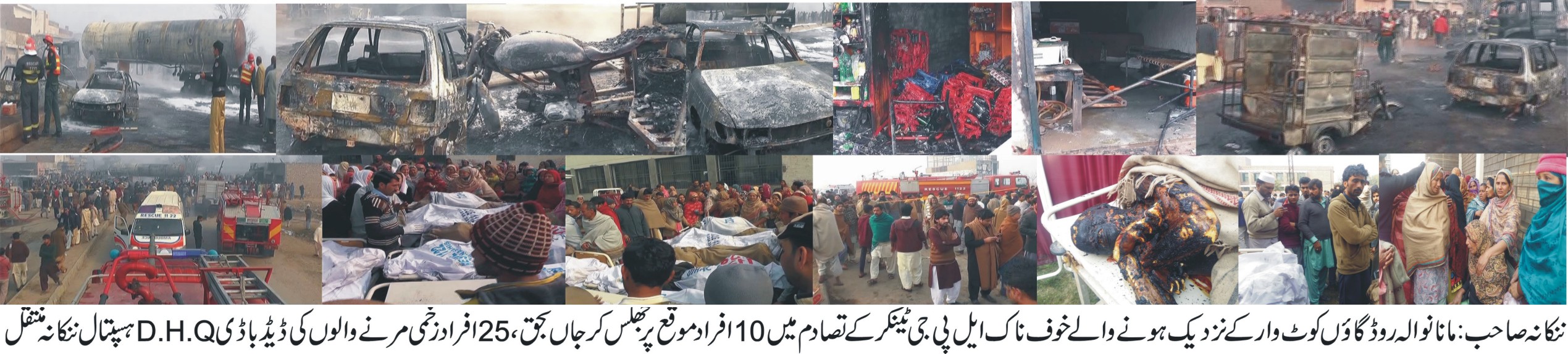 ننکانہ صاحب (زاہد اعوان) دھند کے باعث کار کی گیس سلنڈر والے ٹینکر کو ٹکر کے بعد آگ لگ گئی جس کے نتیجہ میں 13افراد جاں بحق اور 30سے زائد زخمی ہو گئے جن میں سے متعدد کی حالت تشویشناک بتائی گئی ہے ۔جاں بحق ہو نے والوں میں 7 بچے ولید 5سالہ ، حمزہ 5سالہ ، زنیرہ 8سالہ ، حسیب 6سالہ منیب 6سالہ ، فیضان 8سالہ دو سکول ٹیچریں شگفتہ 22سالہ ، شازیہ30سالہ اور نجی ٹی وی چینل کے کیمرہ مین محمد امجد شامل ہیں ،وزیر اعلیٰ پنجاب کا واقعہ پر افسوس کا اظہار، ننکانہ مانانوالہ روڈ پر کوٹ وار کے قریب کار ایل پی جی گیس ٹینکر سے ٹکرا گئی جس کے باعث ٹینکر کا سیفٹی وال ٹوٹ گیا اور دھماکہ ہو گیا ٹینکر کو آگ لگ گئی ،آگ نے قریبی دوکانوں اور مکانوں کو بھی اپنی لپیٹ میں لے لیا،جس کے باعث3کاریں ،دو مسافر رکشے 2موٹر سائیکلوں پر سوار افراد کے علاوہ قریبی دوکانوں میں موجود لوگ بری طرح جھلس گئے جن کو ریسکیو 1122ننکانہ ،شیخوپورہ اوردیگر محکموں کی گاڑیوں نے ڈسٹرکٹ ہیڈ کوآرٹر ہسپتال ننکانہ ،ڈسٹرکٹ ہیڈ کوآرٹر ہسپتال شیخوپوررہ اور دیگر ہسپتالوں میں پہنچایا ، ریسکیو ذرائع کے مطابق زخمی ہو نے والوں میں سے 13 افراد جاں بحق ہو ئے ہیں جاں بحق ہو نے والوں میں سکول جانے والے 7 بچے ،2 سکول ٹیچریں اور نجی ٹی وی چینل کا کیمرہ مین شامل ہیں جبکہ زخمیوں میں 35سالہ اشرف،45سالہ سکندر،28سالہ احمد رضا،35سالہ حیدر،50سالہ عبدالرحمان،35سالہ عارف،95سالہ محمد علی،28سالہ عماد،30سالہ ریاض،30سالہ عنصر،60سالہ کوثر،60سالہ صفیہ،18سالہ انعم،16سالہ شذرہ،23سالہ شاہ زیب،26سالہ ندیم وغیرہ شامل ہیں ،ریسکیو1122 کے مطابق جاں بحق ہو نے والے13 افراد کو ڈسٹرکٹ ہیڈ کوآرٹر ہسپتال ننکانہ پہنچایا ہے آگ نے قریبی دوکانوں اور مکانوں کو بھی اپنی لپیٹ میں لیامتعدد دوکانیں بری طرح جل کر راکھ ہوگئی ہیں باقی دوکانوں میں لگی آگ کو بجھانے کے لئے ریسکیو 1122 کاآپریشن جاری ہے ۔ حادثے کے نتیجہ میں 30 سے زائد افراد زخمی ہوئے ہیں جن میں سے متعدد کی حالت تشویشناک بتائی گئی ہے ،شدید زخمیوں کو الائیڈ ہسپتال فیصل آباد منتقل کر دیا گیا ہے ۔وزیر اعلیٰ پنجاب نے واقعہ پر افسوس کا اظہار کرتے ہوئے زخمیوں کو بہترین طبی سہولتیں فراہم کرنے کی ہدایت کی ہے